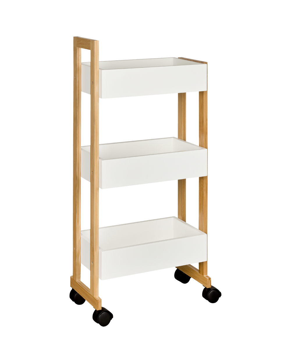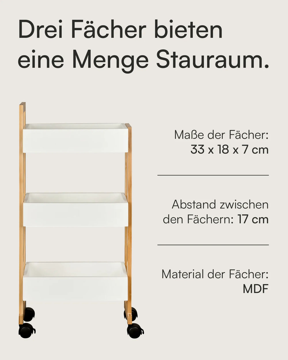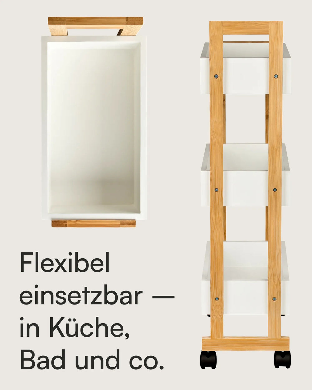 Ablagekörbe aus MDF, Rahmen aus Bambus und vier Rollen, zwei davon feststellbar