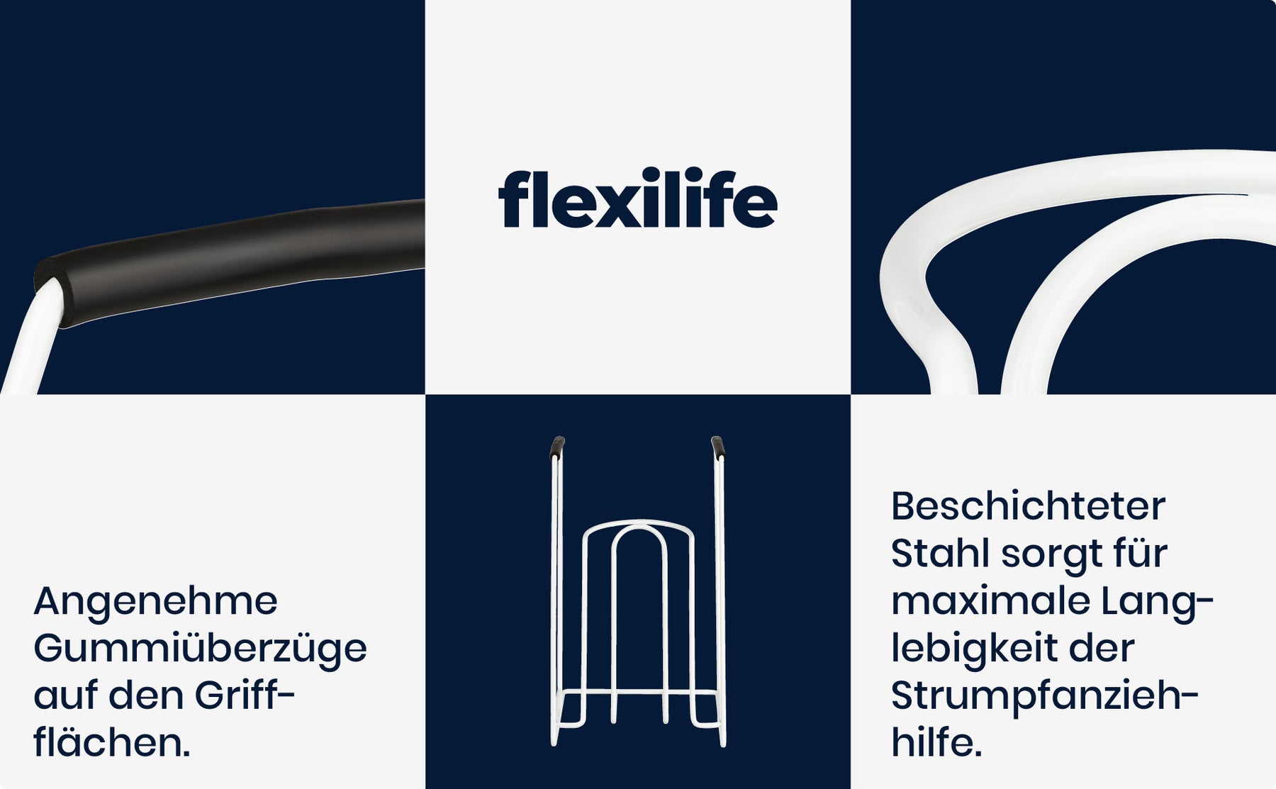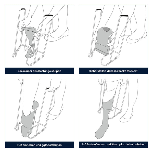 In vier kurzen Schritten lässt sich die Socke mithilfe der flexilife Strumpfanziehhilfe anziehen. Socke einspannen, Fuß in der Hilfe fixileren, über den Fuß ziehen, Strumpfanziehhilfe herausziehen – fertig!